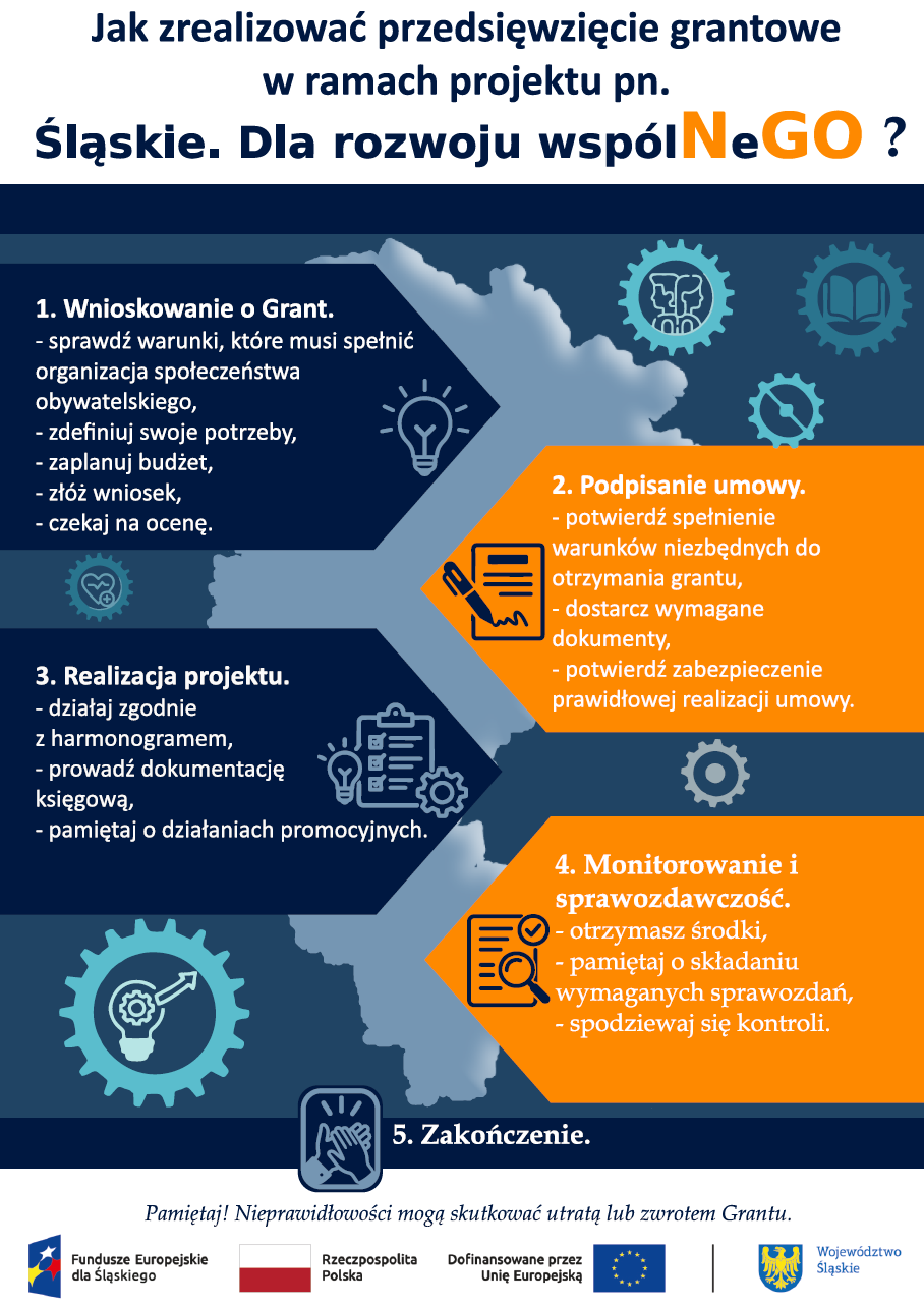 Wszystkie kryteria, jakie organizacja musi spełnić, aby ubiegać się o grant, jak również procedury obowiązujące w ramach projektu grantowego „Śląskie. Dla rozwoju wspólNeGO” - w tym zasady i przebieg naboru wniosków o powierzenie grantów tj.: składania i oceny, a następnie wyboru do finansowania, zasady podpisywania umów o powierzenie grantów, ich realizacji, w tym rozliczania oraz kontroli prawidłowości wydatkowania środków dostępne są na stronie projektu grantowego „Śląskie. Dla rozwoju wspólNeGO” w zakładce Dokumenty i wytyczne. Dane kontaktowe do realizatora projektu znajdują się TUTAJ.